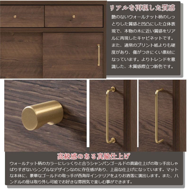 ■商品の仕様/天板・前板:強化プリント紙化粧繊維板、側板・背板:プリント紙化粧繊維板、取っ手:真鍮仕上げ