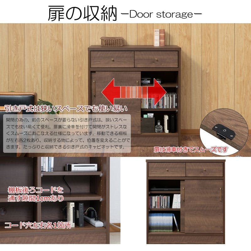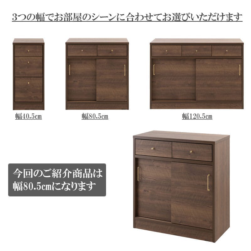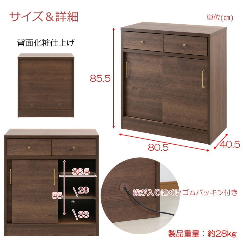 ■商品サイズ/本体:(約)幅80.5×奥行40.5×高さ85.5cm■引出し内寸/(約)幅30.5×奥行33.5×深さ12cm■扉内寸/(左右共通):(約)幅36.5×奥行33(棚板29後部1cm配線用隙間あり)×高さ55cm■棚板/可動式:4枚(3cmピッチ・11段階)■耐荷重量/天板:(約)20kg、棚板:(約)5kg■商品重量/(約)28kg■日本製■完成品(取っ手のみ取り付け)