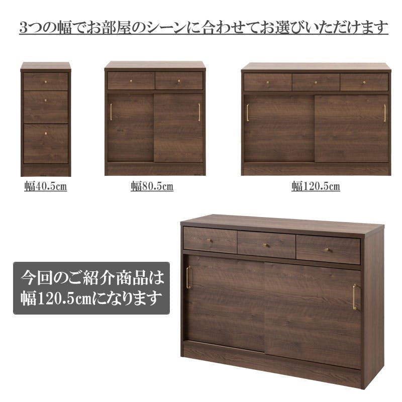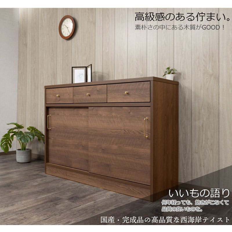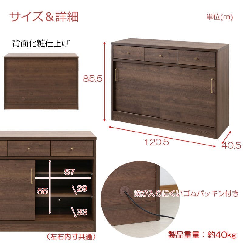 ■商品サイズ/本体:(約)幅120.5×奥行40.5×高さ85.5cm■引出し内寸/(約)幅30.5×奥行33.5×深さ12cm■扉内寸/(左右共通):(約)幅57×奥行33×高さ55cm■棚板/可動式:4枚(3cmピッチ・11段階)■耐荷重量/天板:(約)20kg、棚板:(約)5kg■商品重量/(約)28kg■日本製■完成品(取っ手のみ取り付け)