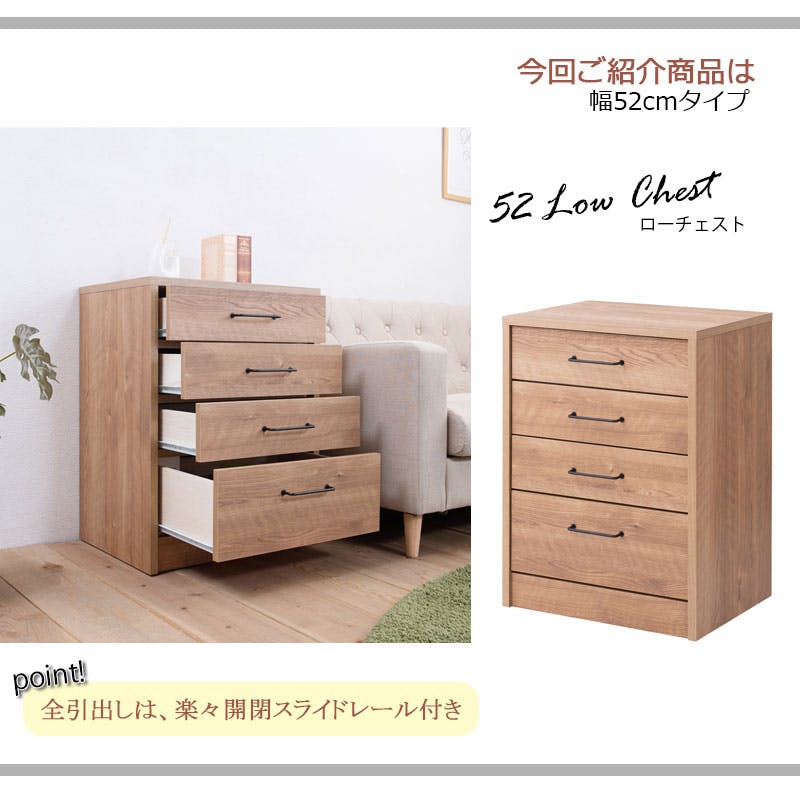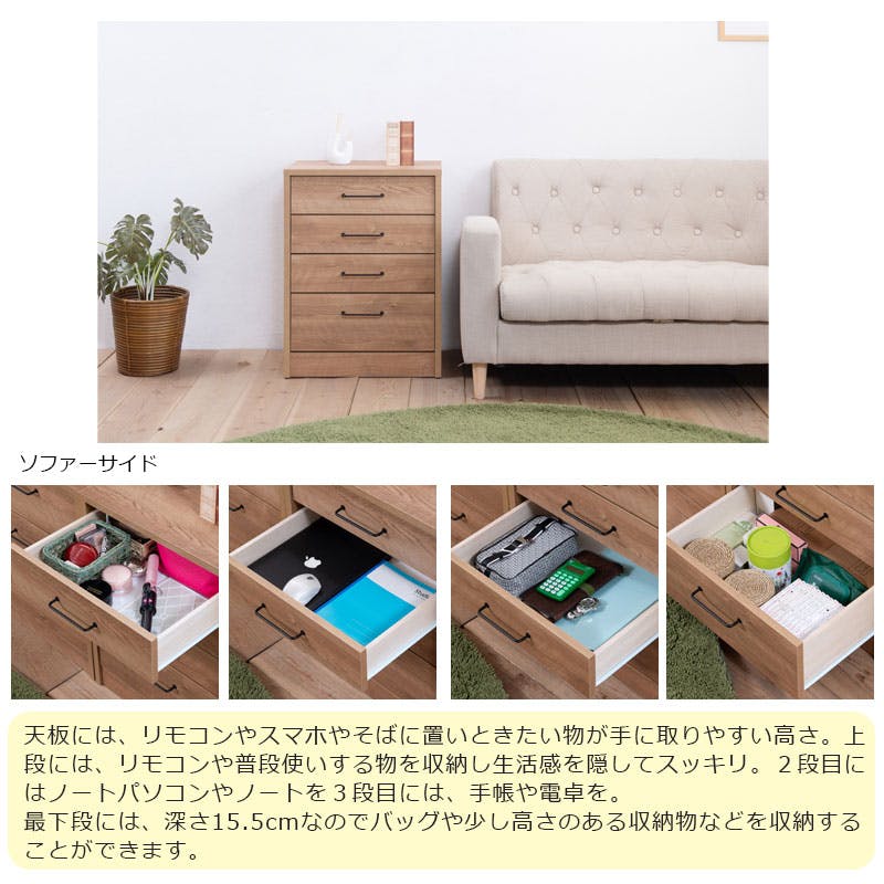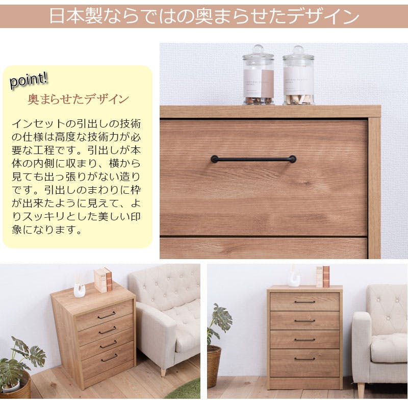 ■商品サイズ/本体:(約)幅52×奥行40.5×高さ69.5cm■引出し内寸/(約)幅43×奥行34×深さ1段目7.5cm(有10.5)、2・3段目7.5(有9)、4段目13.5(有15.5)■耐荷重量/天板:(約)15g■商品重量/(約)19kg■日本製■完成品(取っ手のみ取り付け)