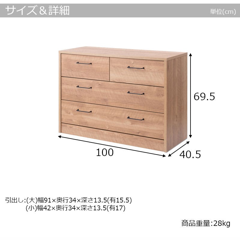 ■商品サイズ/本体:(約)幅100×奥行40.5×高さ69.5cm■引出し内寸/(約)幅(大)91(小)42×奥行34×深さ13.5(有)(大)15.5(小)16.5cm■耐荷重量/天板:(約)20kg■商品重量/(約)34kg■日本製■完成品(取っ手のみ取り付け)