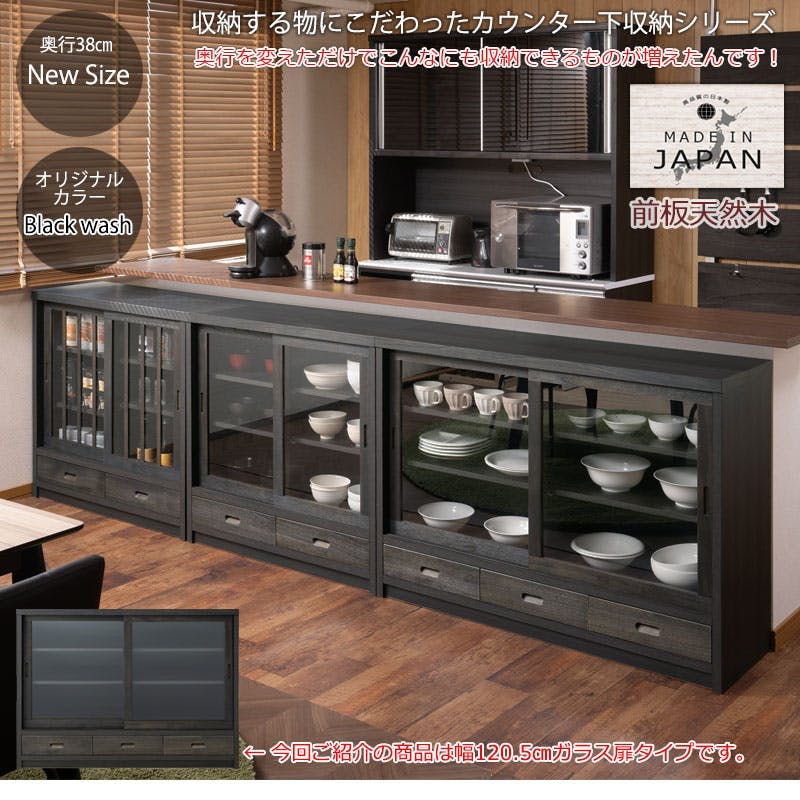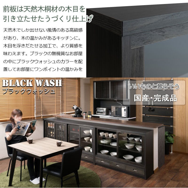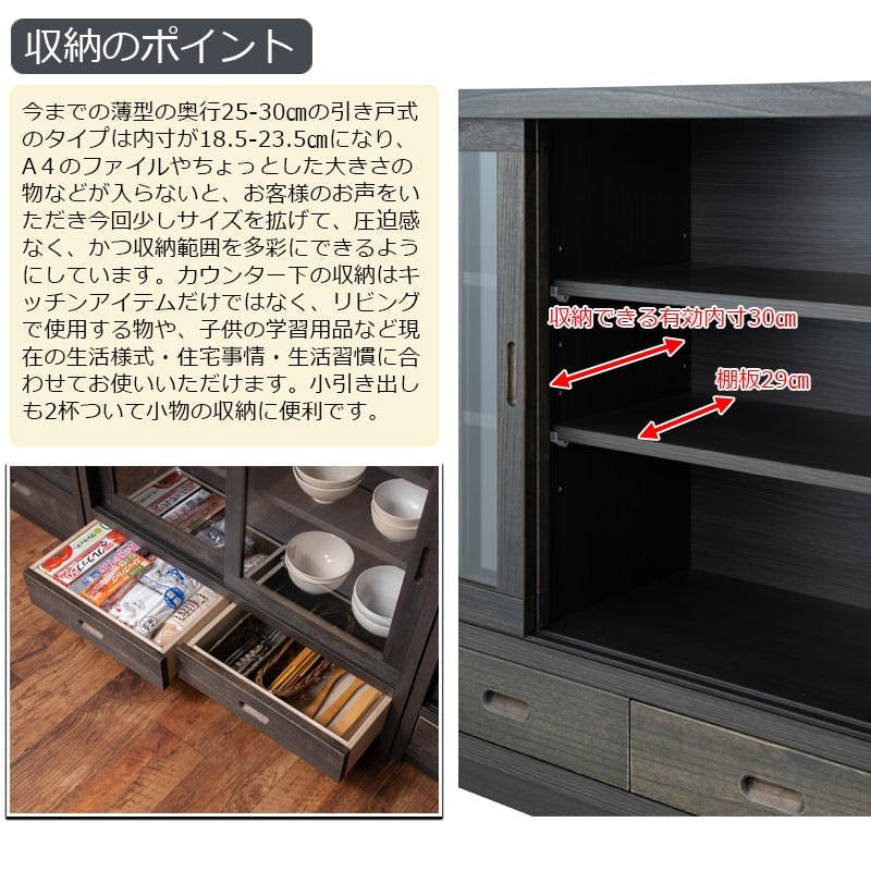 桐の木目を引き立たせたうづくり仕上げ。省スペースでも使い易い。【流星】幅90.5 奥行38 高さ87cm ガラスタイプ ブラック 桐 完成品 日本製 国産 カウンター下収納 キッチン キッチン収納 薄型 省スペース A4収納