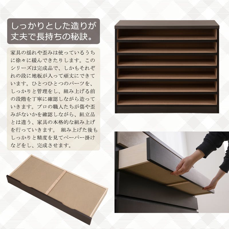 ■商品の仕様/材質/天板:強化プリント紙化粧繊維板、前板:オレフィン化粧繊維板、引出しの側板と奥板:天然木桐材、その他:プリント紙化粧繊維板