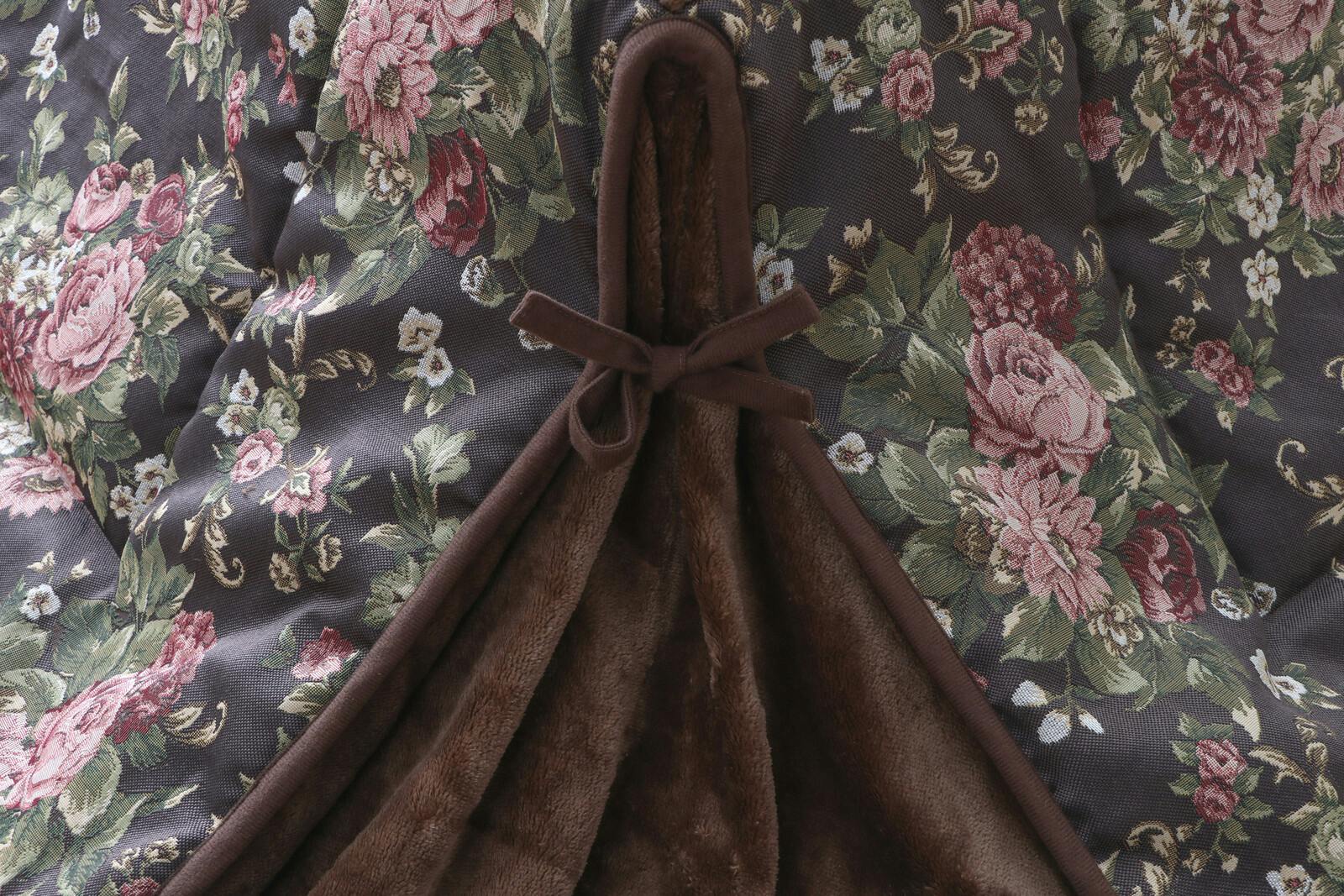 お部屋を広く使える省スペース花柄こたつ布団。 ●四隅がスリット仕様で裾が広がらない省スペースタイプ。ジャカード織りで表現された花柄は立体的で高級感があります。 ●裏面は暖かく、柔らかなフランネル生地を使用 ●角がないからつまづき防止に ●四隅の紐で広がりを抑えよりコンパクトに ●美しい花柄でお部屋を華やかに