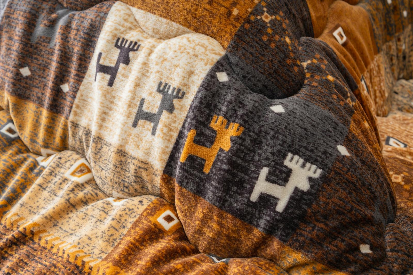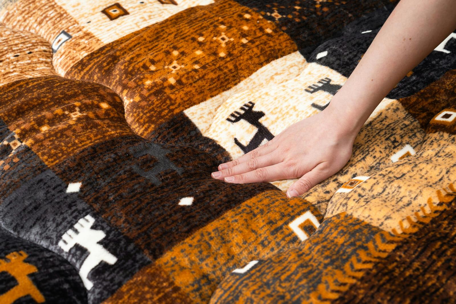 ●パッチワーク調のお洒落なギャベ柄 ●なめらかな肌触りのフランネル生地を両面に使用し暖かい。 ●丸洗いOK!(ネット使用)