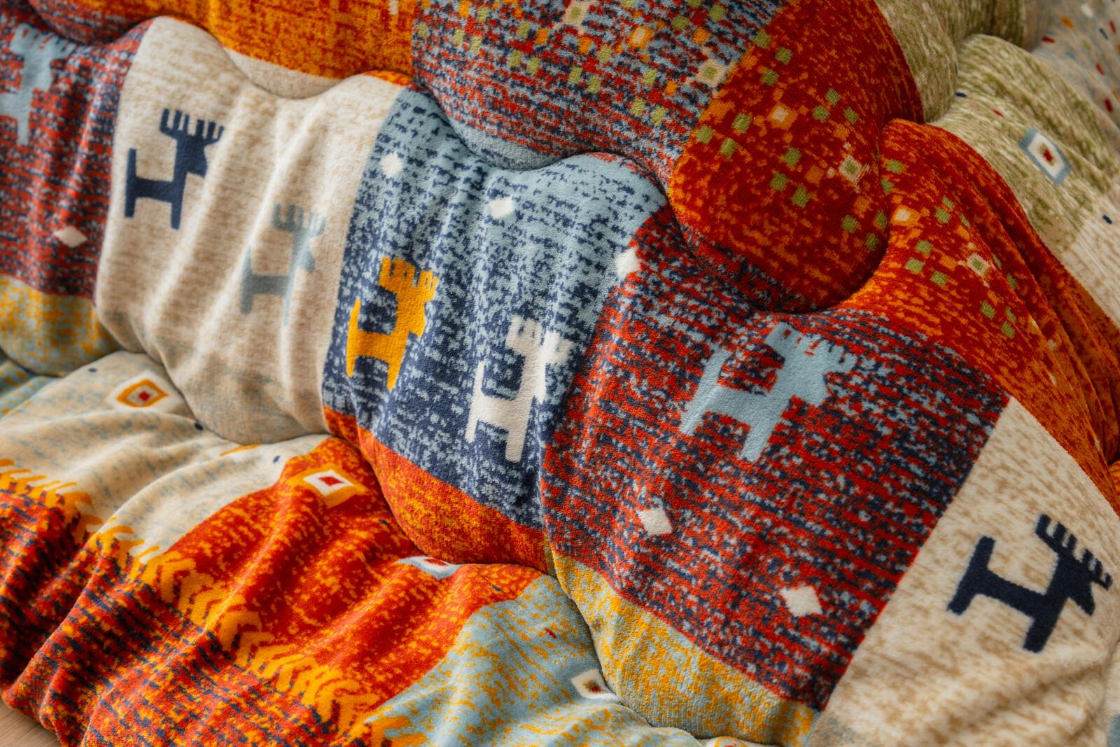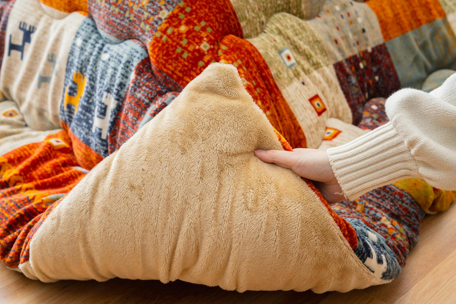 ●パッチワーク調のお洒落なギャベ柄 ●なめらかな肌触りのフランネル生地を両面に使用し暖かい。 ●丸洗いOK!(ネット使用)