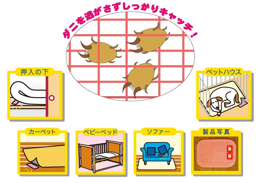 置くだけカンタン!ダニを集めて捨てるだけ!! ●誘引剤でダニを誘い込み、強力粘着テープで捕獲。アレルギーの原因になる死骸や抜け殻、フン等による被害も未然にガードします。 ●ダニを誘い込んで逃さない!