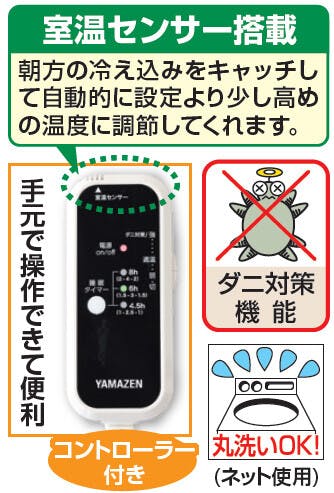 [仕様] ●電源:AC100V(50/60Hz) ●定格消費電力:50W ●消費電力量:強/約35Wh、適温/約18Wh、弱/約6Wh ●電気代(1時間あたり):強/約1.1円、適温/約0.6円、弱/約0.2円 ●表面温度:強/約53度、適温/約35度、弱/約25度 ●1年間保証書付き