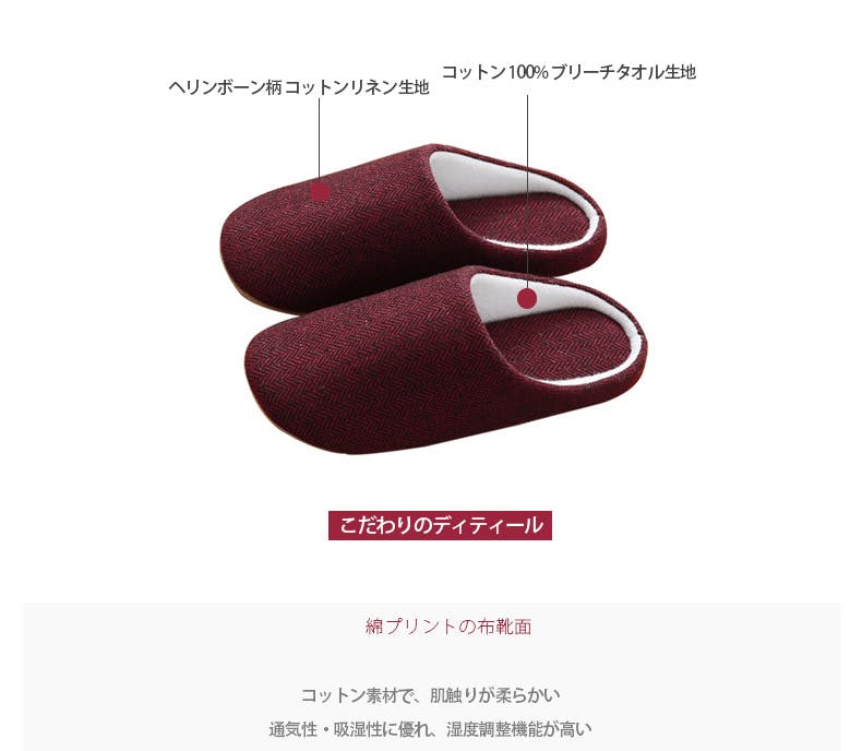吸湿性と吸汗性に優れた素材を使用したスリッパです。高い通気性と優れた吸放湿性により、足元のムレを効果的に抑えます。さらりとした快適な肌触りと、温もりのある素材で、暖かさと湿気対策を両立。