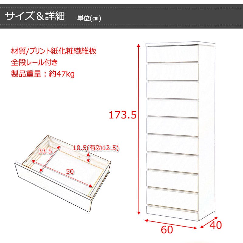 ■商品サイズ/本体:(約)幅60×奥行40×高さ173.5cm■引出し内寸/(約)幅50×奥行33.5×深さ10.5(有効12.5)cm■耐荷重量/引出し:(約)5kg■商品重量/(約)47kg■日本製■完成品
