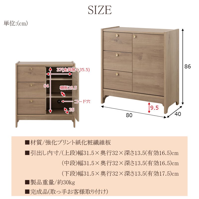 ■商品サイズ/本体:(約)幅80×奥行40×高さ86cm■扉内寸/本体:(約)幅37(金具除く35.5)×奥行29.5(後ろ隙間1cm含む)×高さ64cm■引出し内寸/(約)幅31.5×奥行32×深さ13.5(有効(上から)16.5・16.5・17.5)cm■商品重量/(約)30kg■日本製■完成品(取っ手のみお客様取り付け)