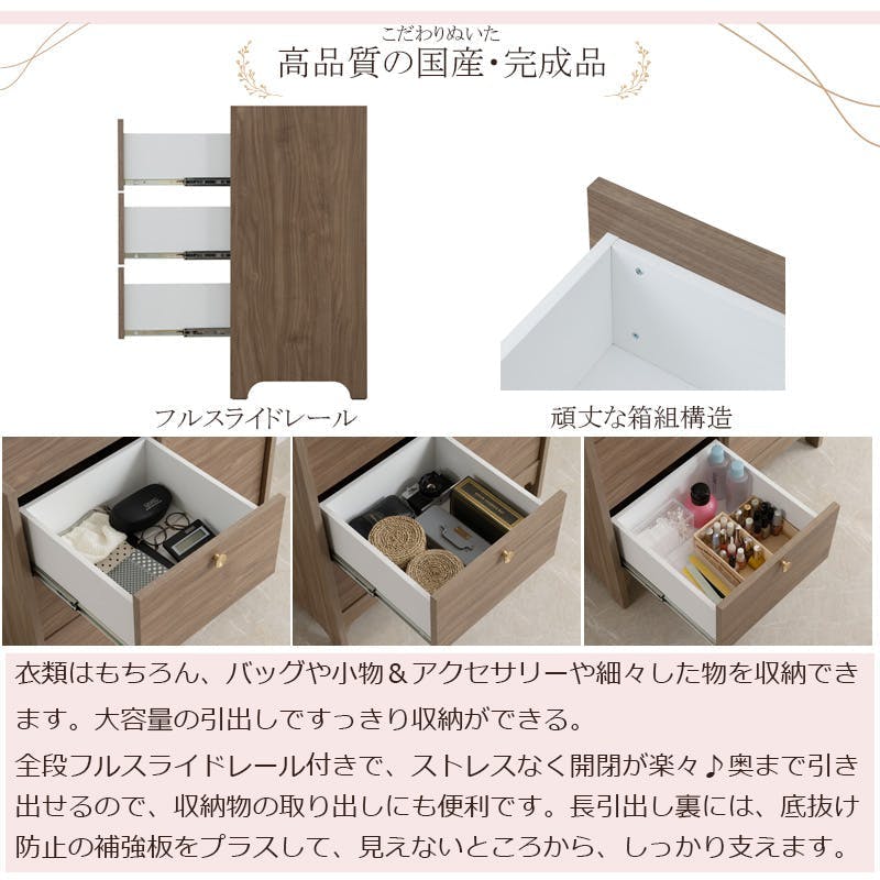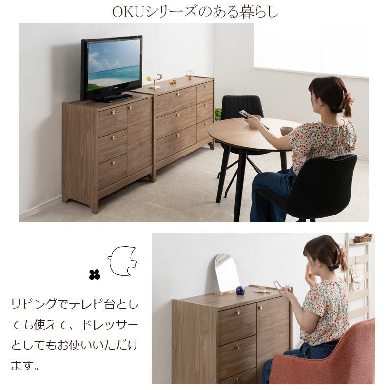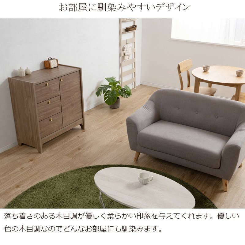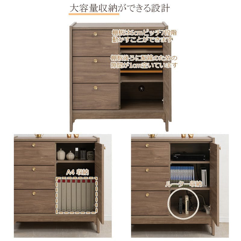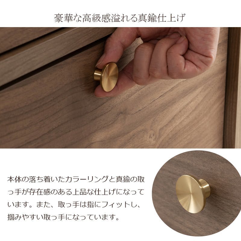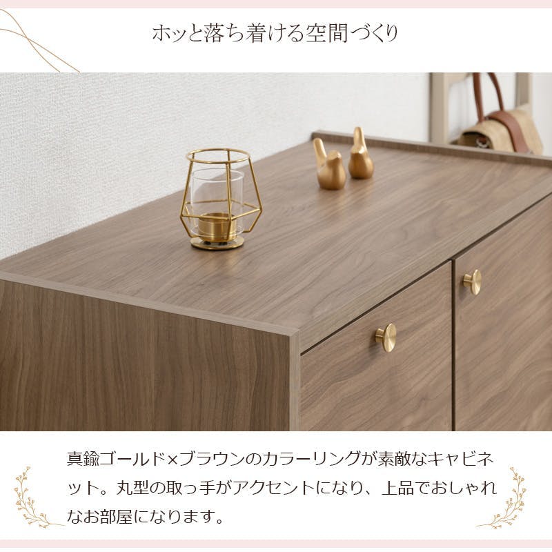 丸型の真鍮取っ手×優しい木目【OKU】シリーズ ブラウン キャビネット 幅80cm 完成品 日本製 北欧 真鍮 A4 フルスライドレール リビングボード 大容量収納 ドレッサー リビング 一人暮らし 新生活 取っ手 引出し