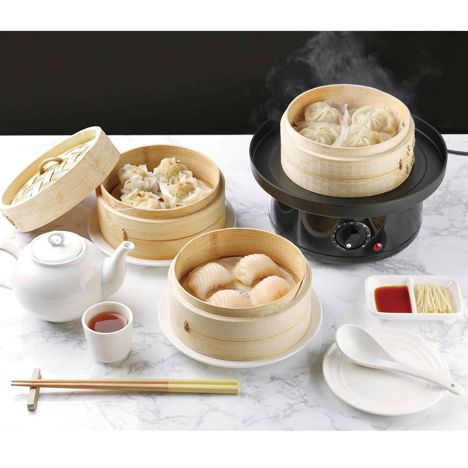 ●サイズ:(約)幅18×奥行19×高さ9.5cm、受け皿:(約)φ22.5×高さ3cm、せいろセット(15cm):(約)φ15×高さ8.5cm、電源コード:約1.4m