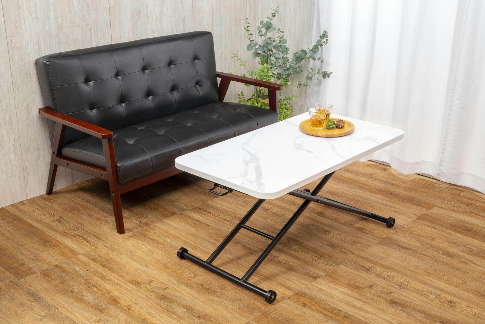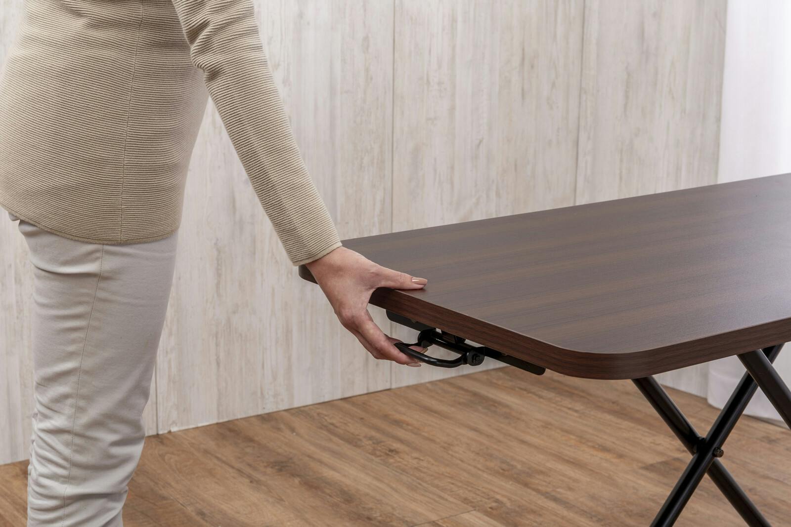 天板の昇降がガス圧シリンダーでラクラク。 ●低くしてローテーブル、高くしてダイニングテーブルや作業台としていろいろな用途に活用できるので一台あるととても重宝します。 ●ハイテーブルからローテーブルまで高さ無段階調節の多目的テーブル!