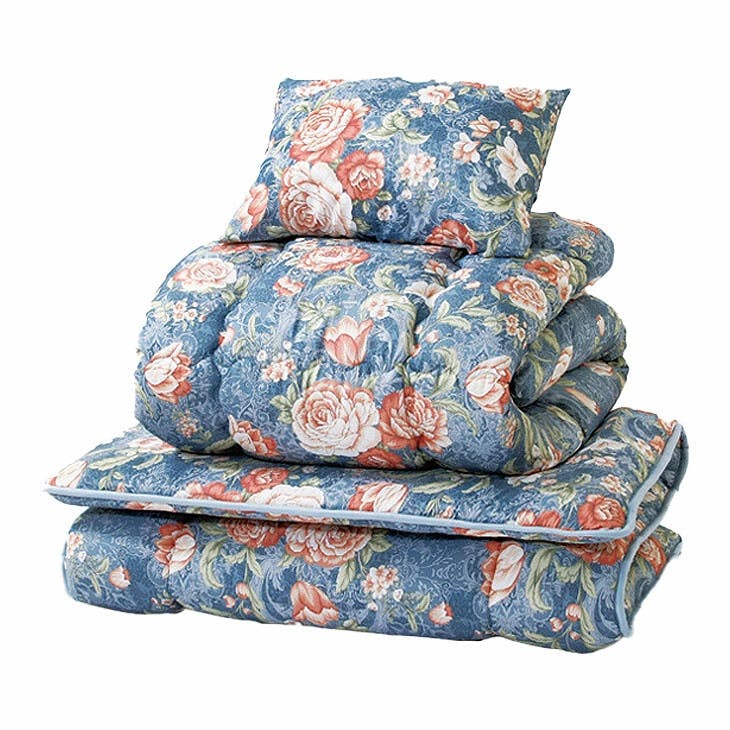 [掛布団・敷布団・枕]側生地:ポリエステル100%、中綿:ポリエステル100%(マイティトップ(R)II ECO混)、[枕カバー(同柄)]ポリエステル80%・綿20%、[掛布団カバー(白)・敷布団シーツ(白)・枕カバー(白)]ポリエステル100%、日本製(カバー:中国製)