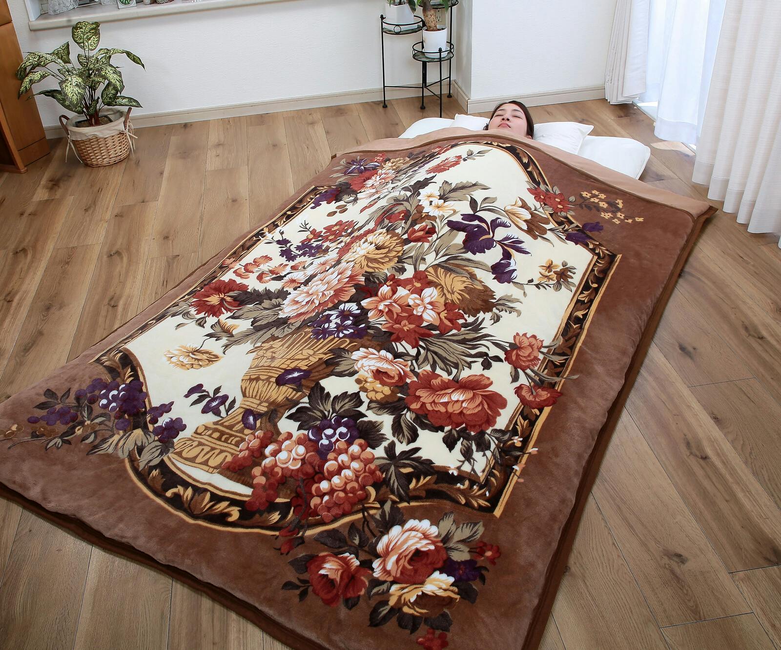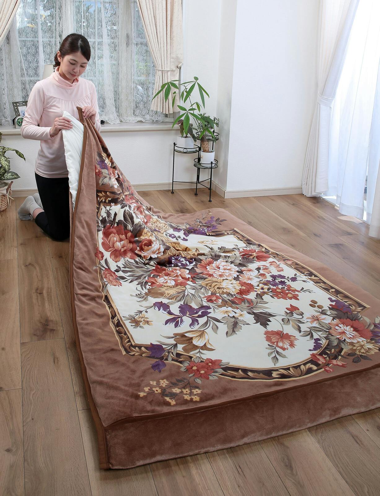 毛布と布団カバーの1枚2役。暖かな衿付の2枚合わせ毛布!! ●立体感ある花柄がお洒落な衿付き2枚合わせ毛布です。頬ずりしたくなるようなふんわり滑らかな肌触りです。 ●1枚で2役/掛け布団カバーに:寒い冬はお手持ちの掛け布団を入れて・毛布に:ロングサイズの合わせ毛布として ●サイドファスナー仕様で出し入れ楽々 ●丸洗いOK(ネット使用)