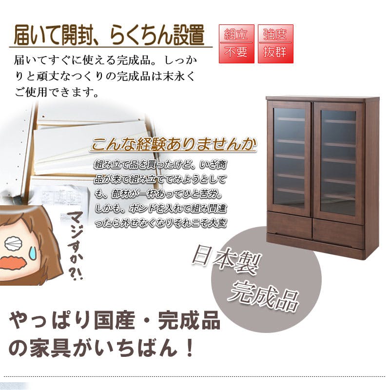 ■商品サイズ/本体:(約)幅80×奥行32×高さ121cm■引出し内寸:(約)幅32×奥行22×深さ14cm 、扉内寸:(約)幅(左右)35×奥行28×高さ(上)42(下)44cm■棚板/可動式8枚(6cmピッチ・4段階)■耐荷重量/棚板:(約)5kg■商品重量/(約)37kg■日本製■完成品