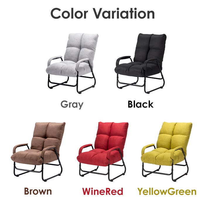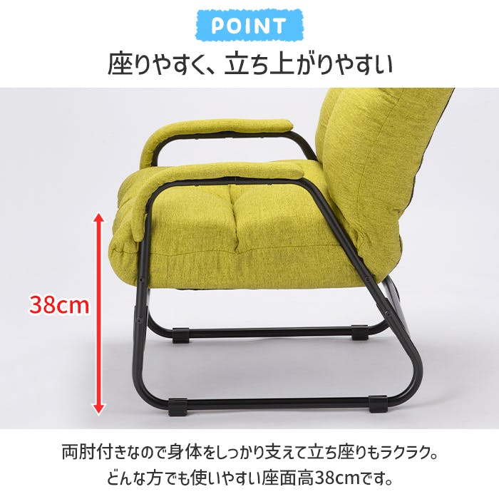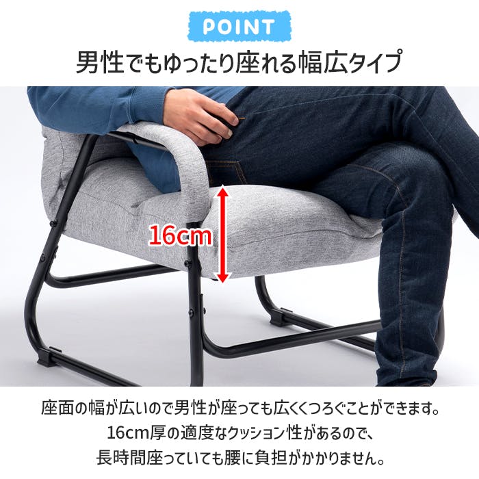 横幅が広めの座り心地を重視した肘掛け付き高座椅子。5段階のリクライニング機能で、ご自分に合った角度でご使用できます。座面の厚さは約16cmで適度なクッション性があり、長時間座っていても腰に負担がかかりません。脚部にはフローリングに傷をつけない傷防止フェルトが付いており、フレームは角が出ていないので安心です。使わないときは背もたれを折り曲げて収納できます。