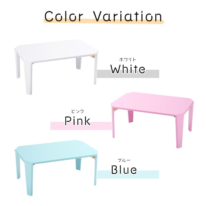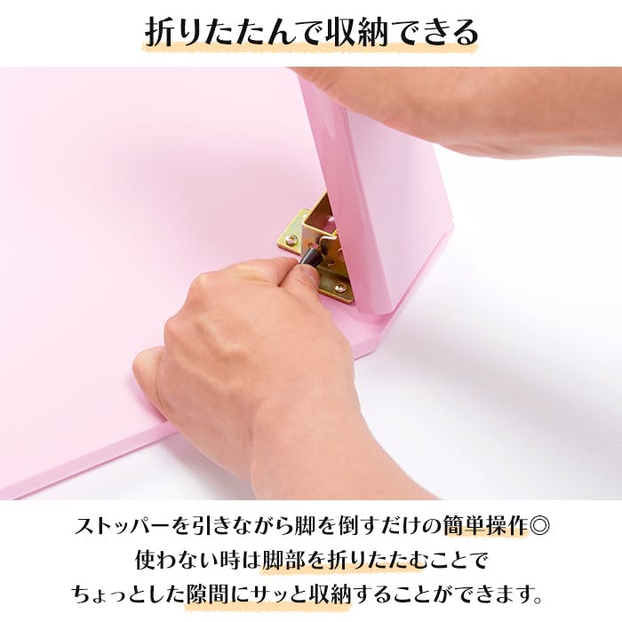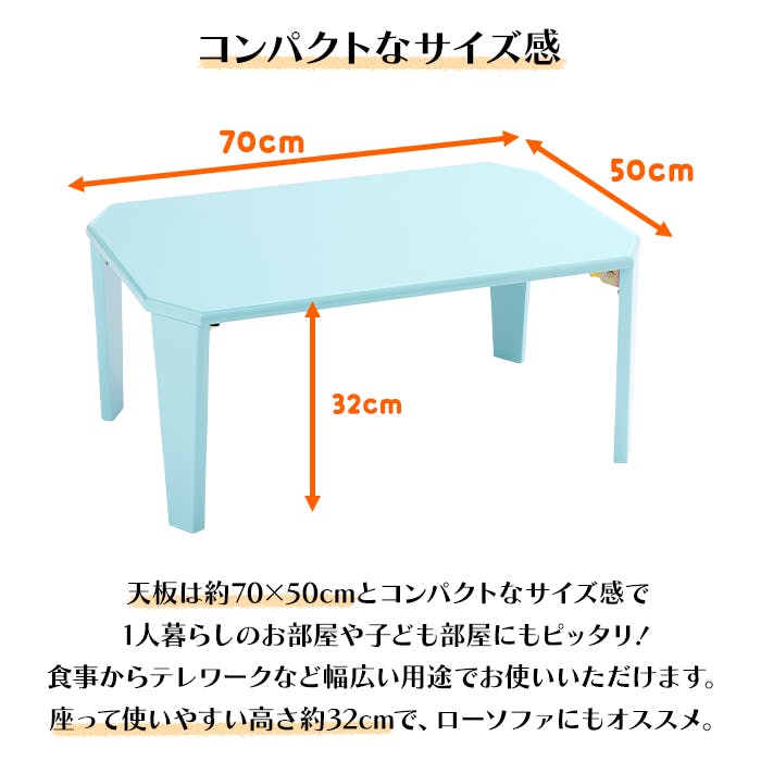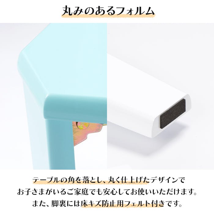 コンパクトでチョコっと使える、可愛くて便利な折りたたみテーブル。折り畳み式でコンパクト設計なので、置き場に困らず必要な時にサッと取り出してすぐに使えます。ウレタン樹脂塗装で光沢のある鏡面仕上げ。傷がつきにくく、汚れが拭き取りやすい加工です。可愛らしいパステルカラーと角に丸みを持たせたデザインで、子供部屋にもおすすめです。折り畳みは、つまみを押すだけの簡単操作。脚裏には傷防止のフェルトが付いています。