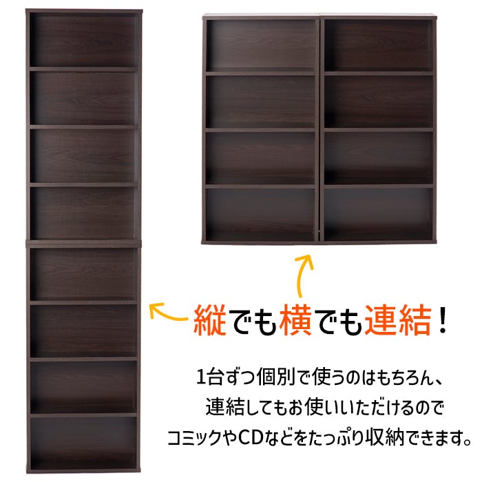 コミックの収納に特化した、コミックラック2台セット。奥行16.5cmなので、漫画本や文庫本などの小さめの書籍、CD・DVDなどの収納にとても便利。2段重ねも横置き連結も可能で、たくさん収納したい方におススメです。付属の連結金具は、上下の固定補強や転倒防止として利用できるので安心です。