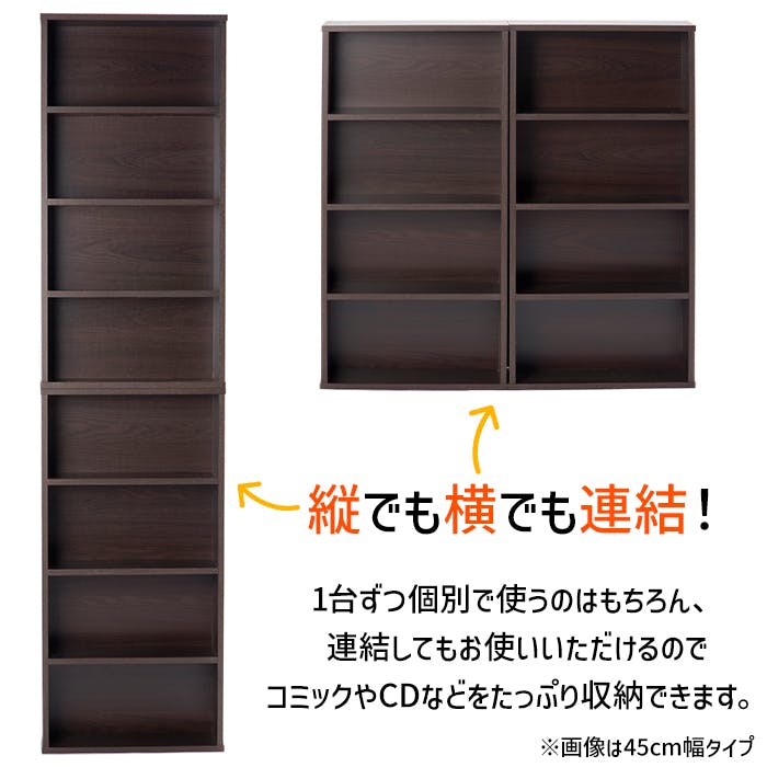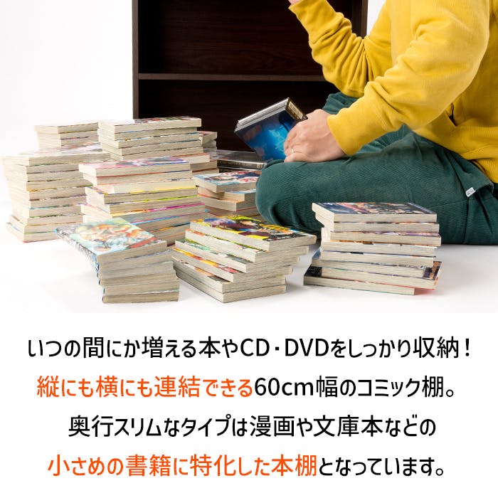 コミックの収納に特化した、コミックラック2台セット。奥行16.5cmなので、漫画本や文庫本などの小さめの書籍、CD・DVDなどの収納にとても便利。2段重ねも横置き連結も可能で、たくさん収納したい方におススメです。付属の連結金具は、上下の固定補強や転倒防止として利用できるので安心です。
