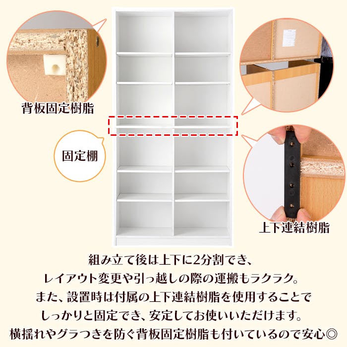 収納力抜群の木製本棚。最大で6段2列の収納スペースを設けることができます。書斎やオフィスはもちろん、リビングや子供部屋などでも収納棚としてお使いいただけます。スペースを無駄なく使え、A4ファイルやインナーボックスもスッキリ収まります。(※中段は固定棚です)下段は上げ底仕様なので収納物を出し入れしやすく、埃などが侵入しにくい仕様です。組立て後は上下に2分割できるので、レイアウトの変更や引っ越しの際の運搬が容易です。また、設置時は上下連結部品を使用することでしっかりと固定できます。