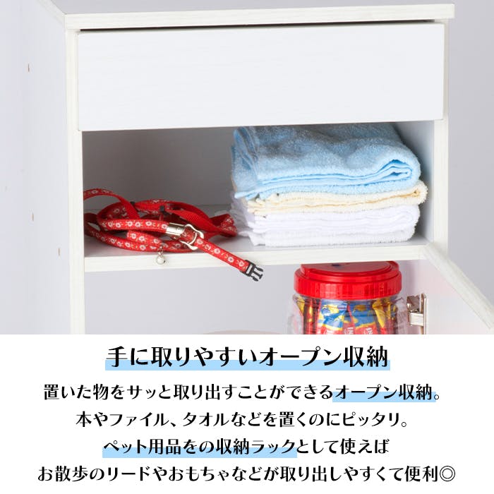 様々なシーンで活躍するキャスター付きの収納ラック。小物整理に便利な引出し付きです。扉内は背面オープン仕様で配線を綺麗に通すことができ、収納物に合わせて高さ調節ができる可動棚になっています。