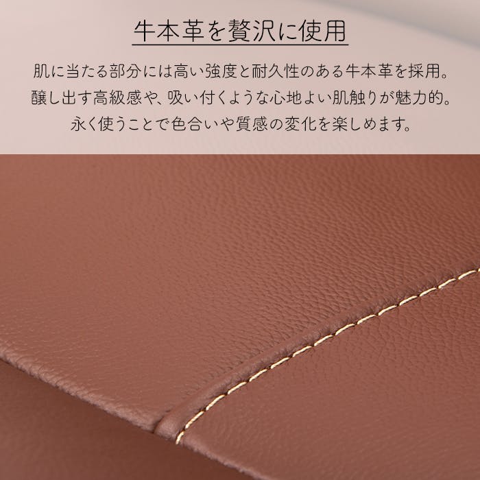 牛本革生地を贅沢に使用した、高級感あふれるリクライニングチェア。本物のレザー特有のしっとりとした質感と上品な風合いがお部屋をワンランク上の空間にします。チェアーの座面や肘掛けなど、肌が触れる部分に本革を使用しています。※チェア背面にはPVC生地を使用しています。