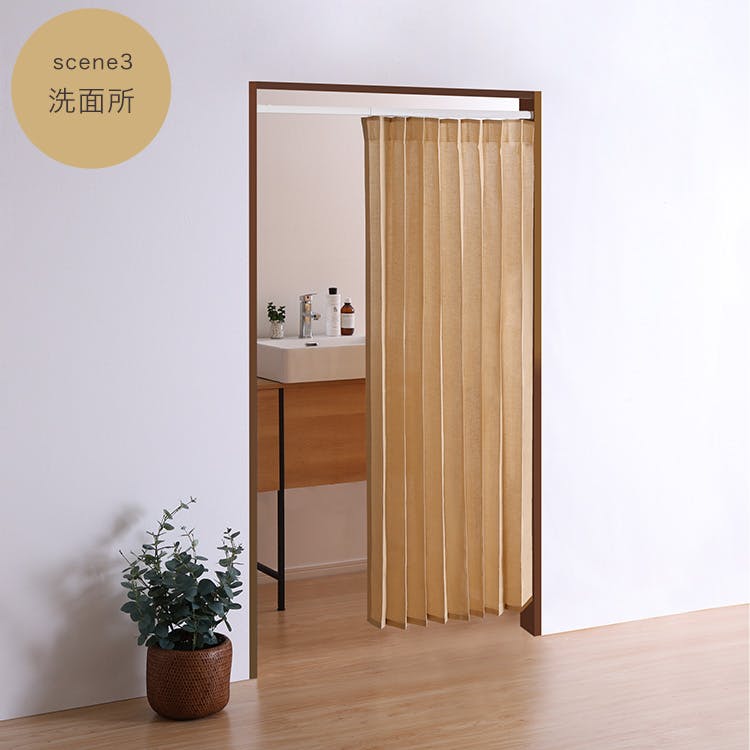 カーテンは取り外して手洗い可能なので、お手入れラクラク。程よい透け感があり、間仕切りをしながらも暗くなりすぎない。左右のみで固定するので天井がない場所にも最適。