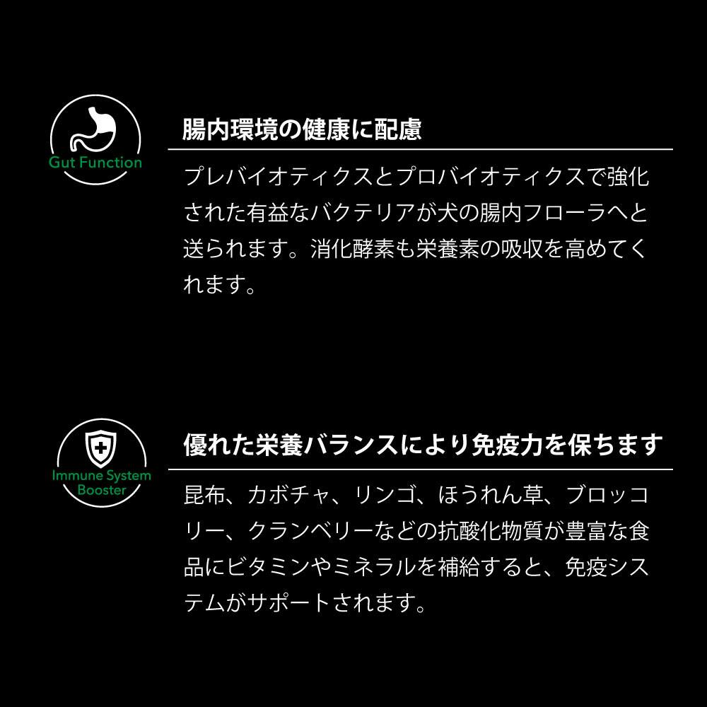■皮膚:オメガ3とオメガ6脂肪酸は、皮膚の炎症を軽減し、犬の皮膚と被毛の状態を改善します。■イミューシステム:ケルプ、カボチャ、リンゴ、ほうれん草、ブロッコリー、クランベリーなどの抗酸化物質が豊富な食品にビタミンやミネラルを補給すると、免疫システムがサポートされます。■以下の素材は使用しておりません<穀物、人工着色料、人工防腐剤、人工香料、トウモロコシ、大豆、小麦>