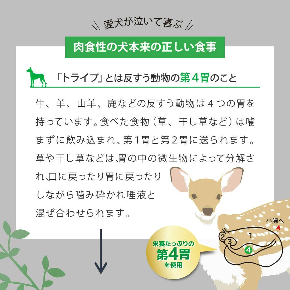 ■なぜ犬たちはトライプが好きだといわれているの?■人間と暮らすようになり、私たちと同じような食事内容にも適応してきた犬たちですが、犬たちの祖先にあたるオオカミなどの野生動物たちは、狩りをして捕まえた獲物のどこから食べ始めるか、それは真っ先に獲物の「胃(トライプ)」を食べ始めるそうです。