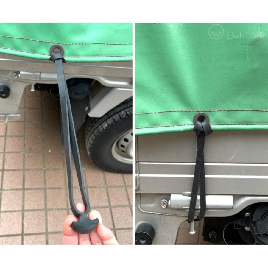 ゴム先端がアンカー形状で指を掛けやすいため、トラックシートの取付、脱着が容易です。耐候性に優れたEPDM素材を採用することにより、従来のトラック用ゴムバンドより長期間使用可能です。