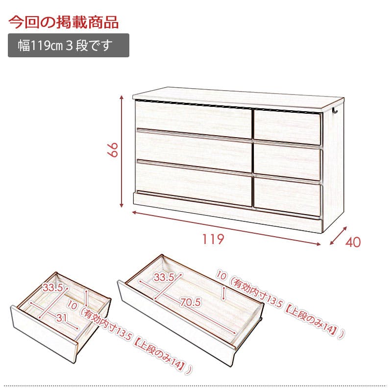 ■商品サイズ/幅119×奥行40×高さ66cm■引出し内寸/(約)幅(小)31(大)70.5×奥行33.5×深さ10(有効13.5)cm■付属品/フック1個■耐荷重量/天板:(約)20kg■商品重量/(約)33kg■日本製■完成品