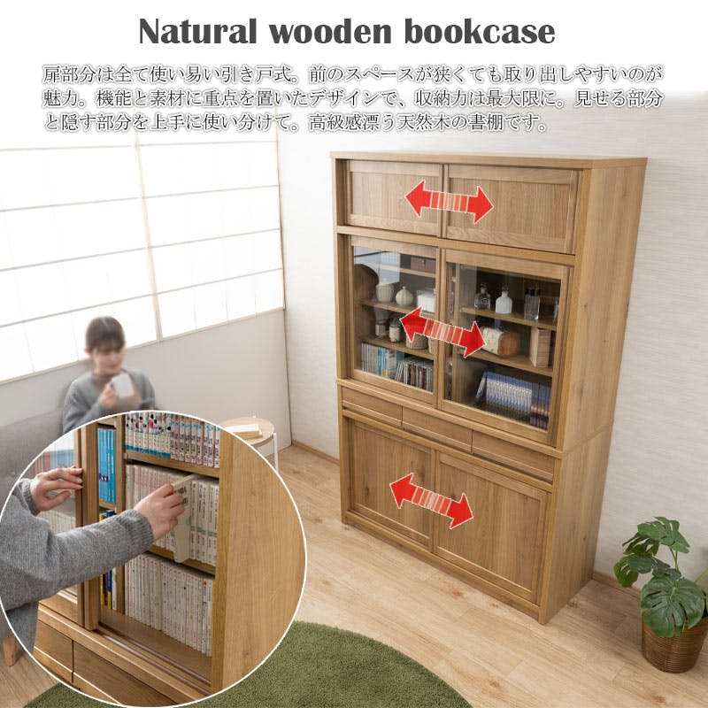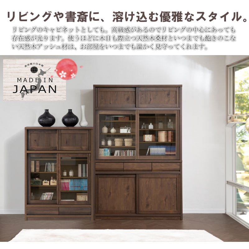 配送設置付 天然木アッシュ材 桑材使用 【優月】シリーズ 幅120 奥行44 高さ182 本棚 書棚 ブックシェルフ ブラウン 完成品 日本製 木製 北欧 モダン ガラス扉 収納 収納棚 引き戸 引き出し 引出 CD収納 DVD収納 大容量