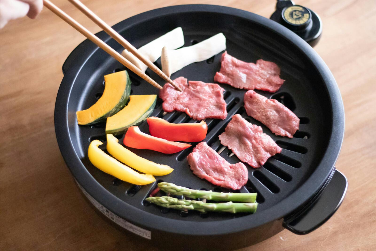 旨味は逃がさず余分な脂は落としてヘルシーに ●ハイパワーで一気に焼くので素材の旨味をギュッと閉じ込めて、美味しくヘルシー!余分な脂は下の水受け皿に落ちるので煙が出にくい仕組みです。 ●煙を気にせず焼肉!!