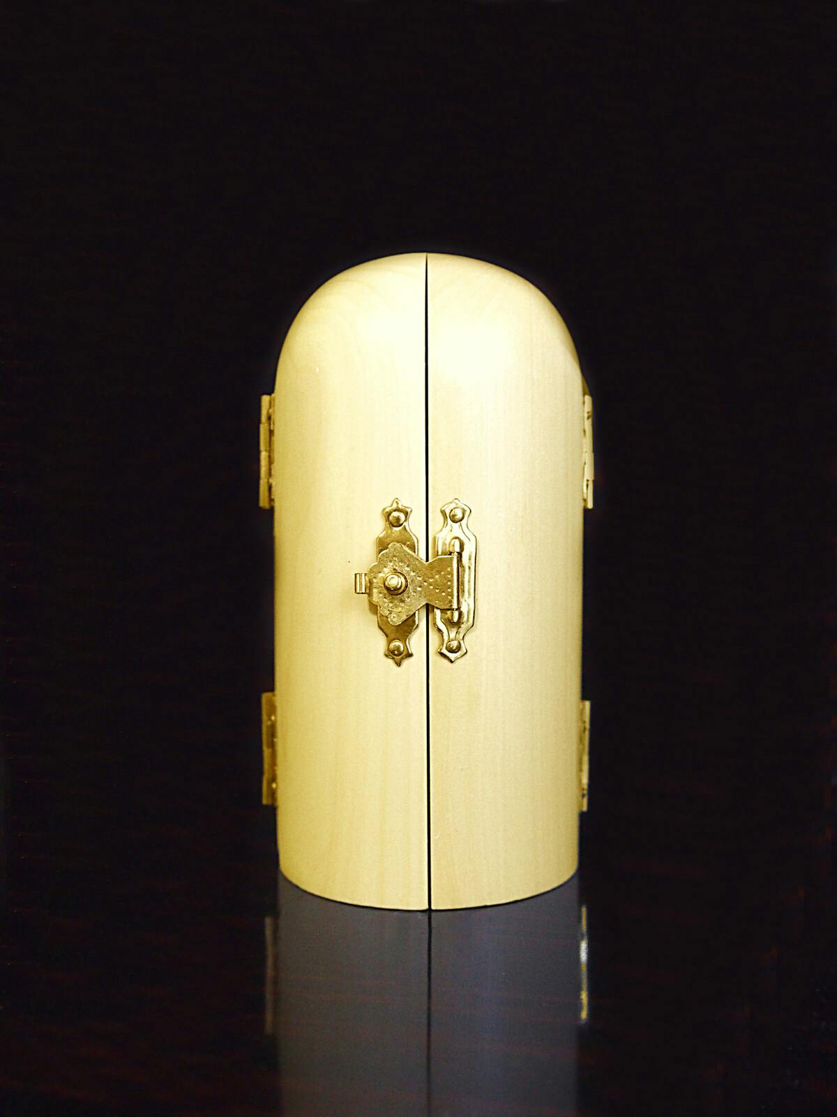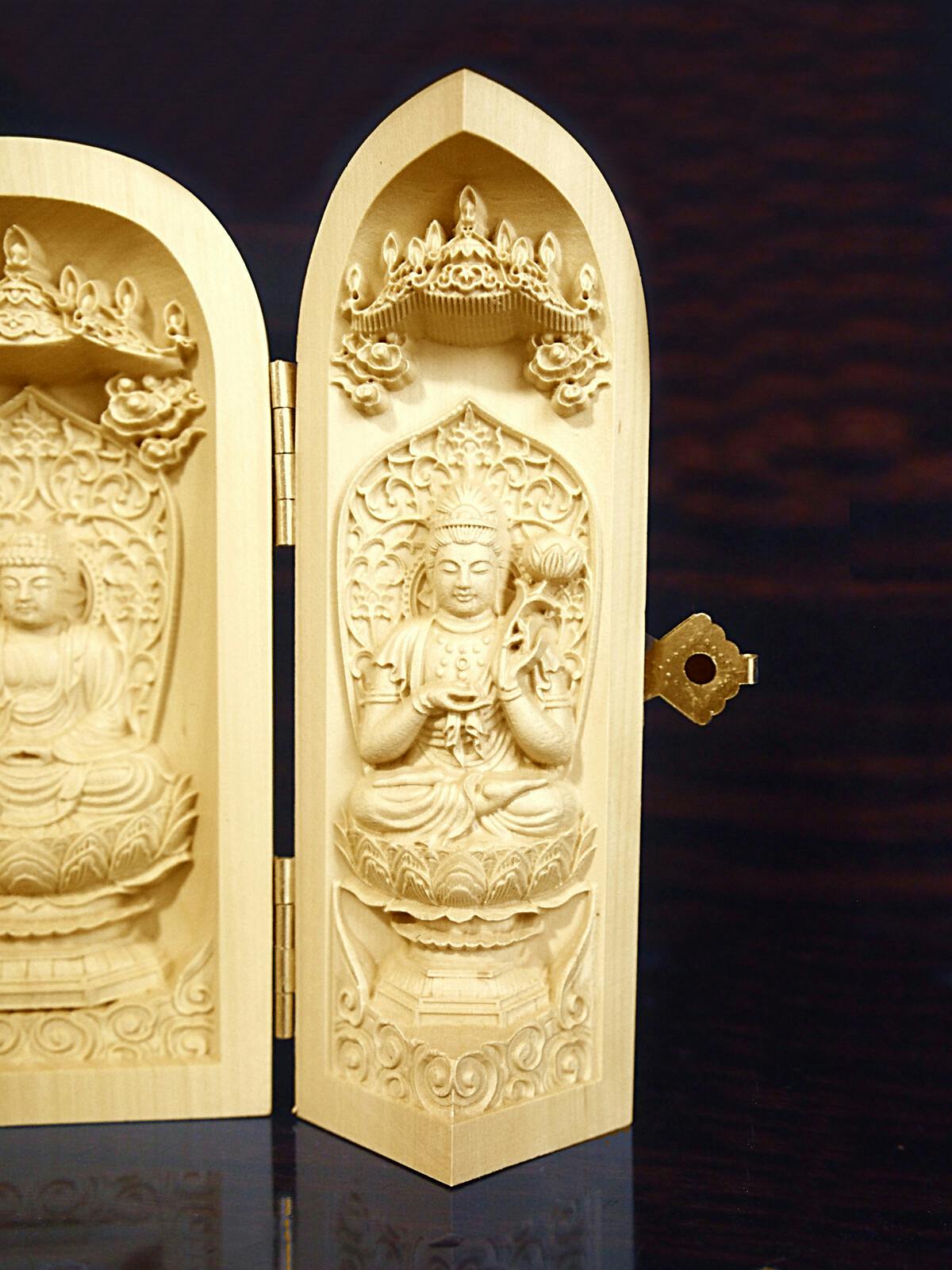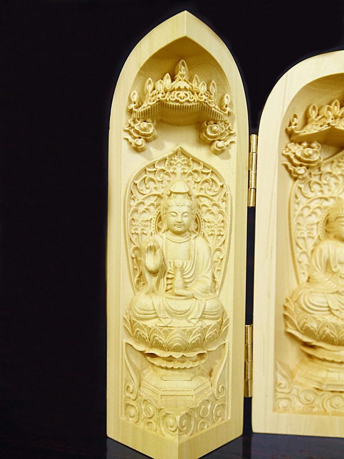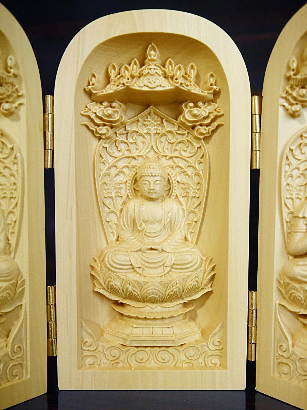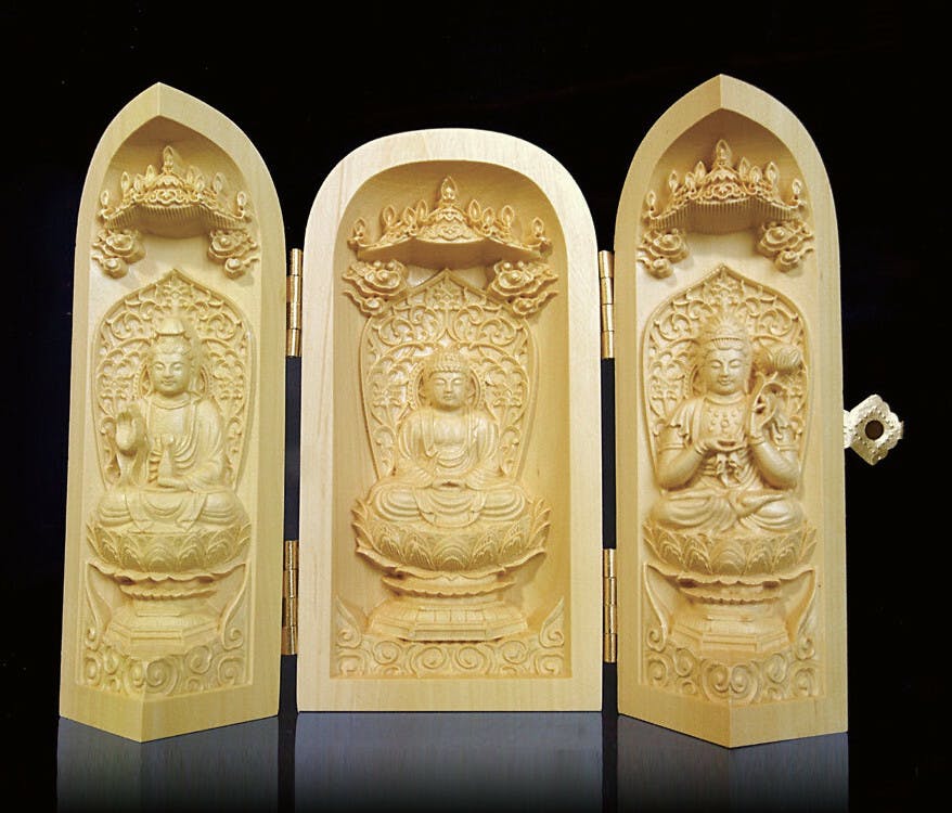 天然ツゲ材使用の繊細に彫られた仏像 ●仏様の御加護により平穏な生活を願う厄除け三開仏像です。 ●勢至菩薩・釈迦如来・観音菩薩 ●手の平サイズで旅行先にもお守りとして持ち運べます。 ●扉を閉じればコンパクトに