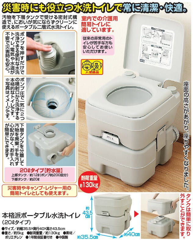 ●20Lタイプ【貯水量】:上部タンク/約12L(ポンプ約200回分)、下部タンク/約20L ●タンクは簡単に取り外すことができます。 ●耐荷重量約130kg ●災害時やキャンプ・レジャー用の簡易トイレとしても使えます。 ●1年間保証書付き