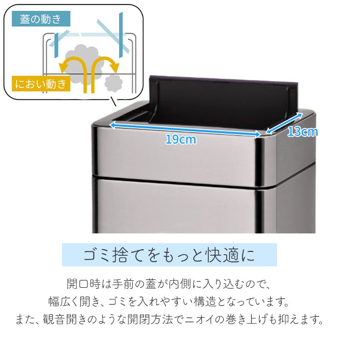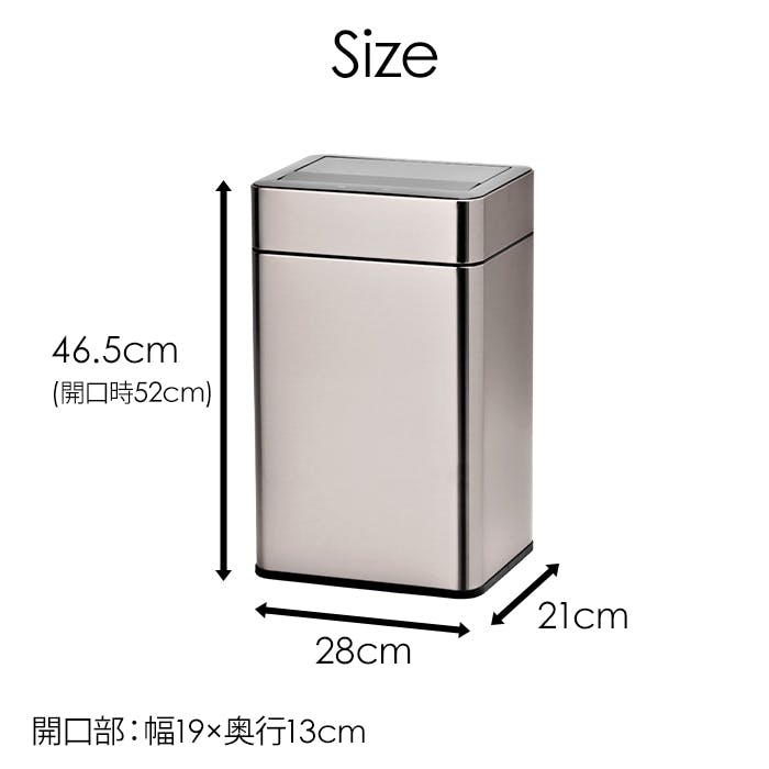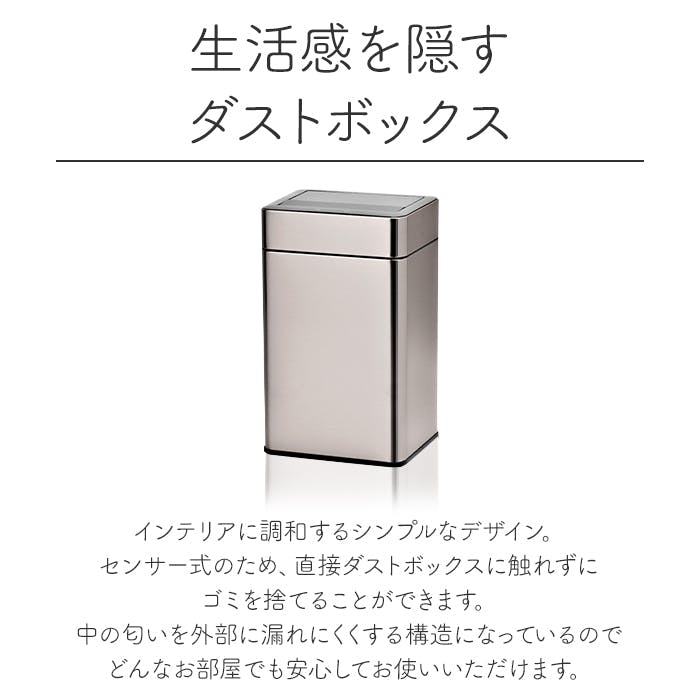 シンプルなダストボックス。センサー式なので、両手が塞がっていても、ゴミ箱に触れずにゴミを捨てることができ衛生的です。観音開きのような開閉方法で、開口時の匂いの巻き上げを抑えます。さらに、オゾン除菌脱臭機能を搭載!スイッチ1つでゴミ箱内の除菌脱臭ができます。本体サイズ+約7cm程の空間があれば蓋の開閉が可能なので、デスク等の下にも設置できます。付属のUSB充電式のバッテリーパックまたは、単3電池で使用できるので、使用場所を選ばず生活スタイルに合わせて設置が可能です。