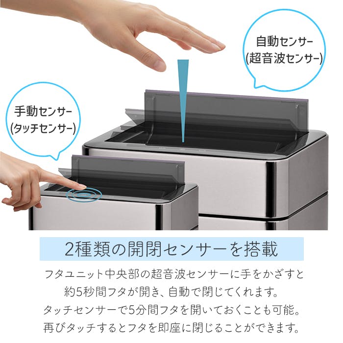 センサー式 ゴミ箱 ステンレス製 ダストボックス 20L 静音 自動開閉 除菌脱臭機能付き 臭わない SUS430 横型 シンプル チタン調 シルバー