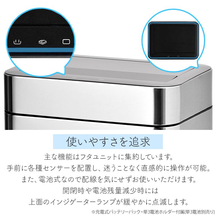シンプルなダストボックス。センサー式なので、両手が塞がっていても、ゴミ箱に触れずにゴミを捨てることができ衛生的です。観音開きのような開閉方法で、開口時の匂いの巻き上げを抑えます。さらに、オゾン除菌脱臭機能を搭載!スイッチ1つでゴミ箱内の除菌脱臭ができます。本体サイズ+約7cm程の空間があれば蓋の開閉が可能なので、デスク等の下にも設置できます。付属のUSB充電式のバッテリーパックまたは、単3電池で使用できるので、使用場所を選ばず生活スタイルに合わせて設置が可能です。