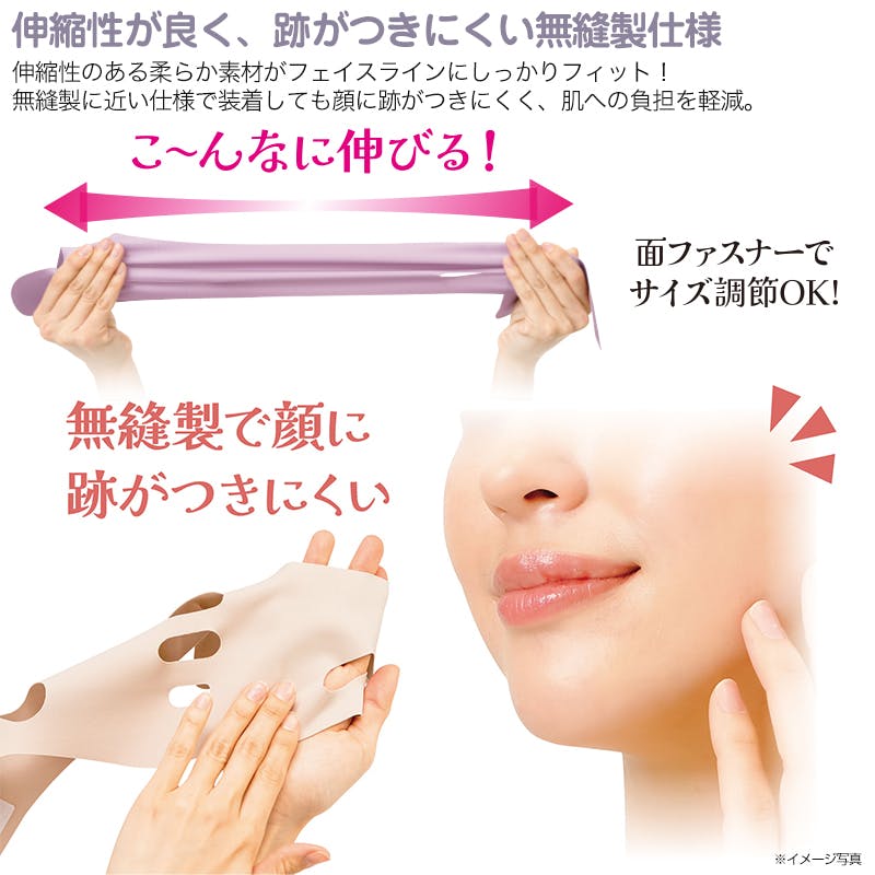 歯の矯正中の方、あご関節に異常のある方、18歳未満の方は使用しないでください。面ファスナーが衣類や髪に引っ掛からないよう注意し、洗濯時は面ファスナーを閉めてください。