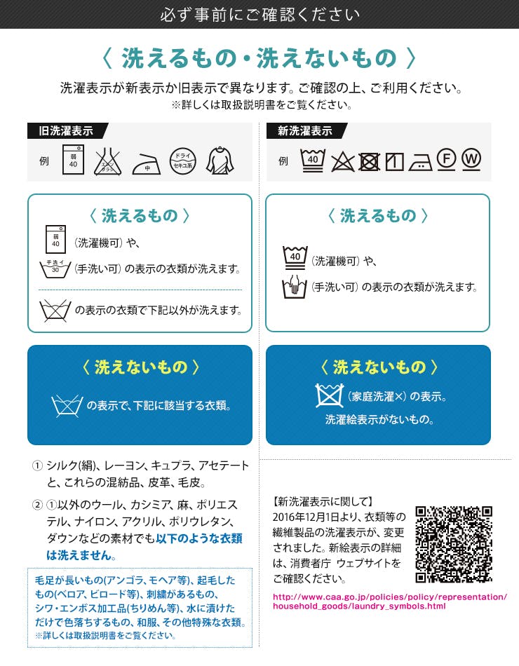 衣類の洗濯表示を確認し、取扱説明書に従って使用してください。