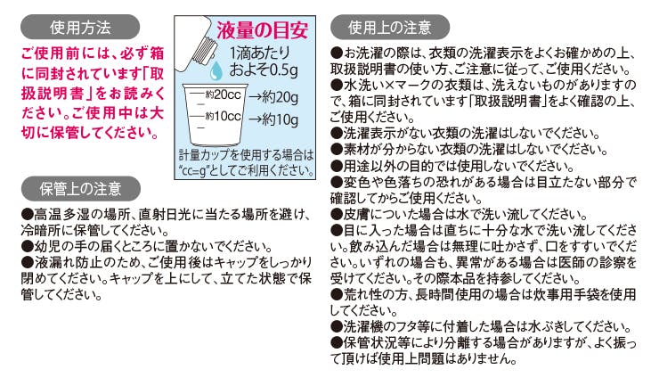 液性:弱酸性。手洗い目安:水1Lに洗剤2g(約4滴)。
