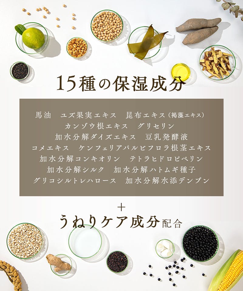 水、セテアリルアルコール、グリセリン、馬油、豆乳発酵液、褐藻エキス、加水分解シルクほか