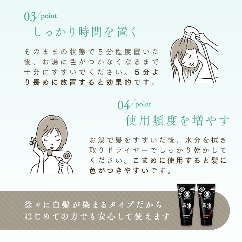 シャンプー後に水気を切り、適量を髪全体になじませ5分程度置きます。