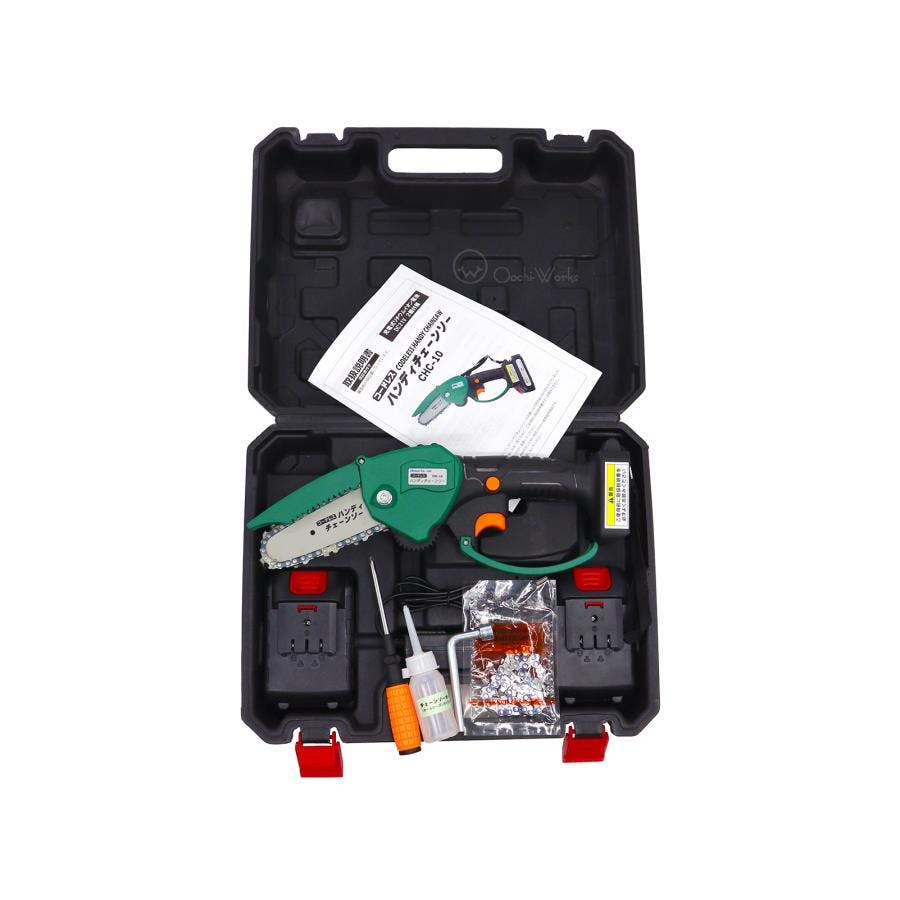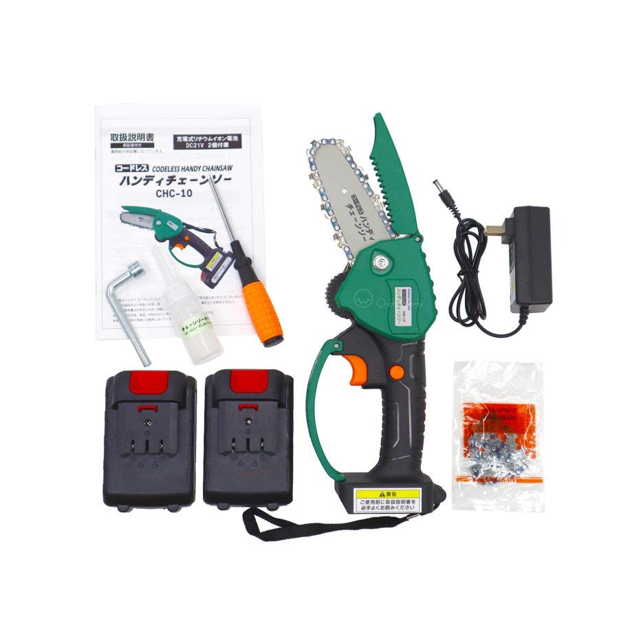 ◆チェーンソー本体×1 ◆リチウムイオンバッテリー×2 ◆充電器×1 ◆交換用ソーチェーン×1 ◆チェーンカバー×1 ◆+ドライバー×1 ◆ボックスレンチ×1 ◆オイル×1 ◆取扱説明書×1