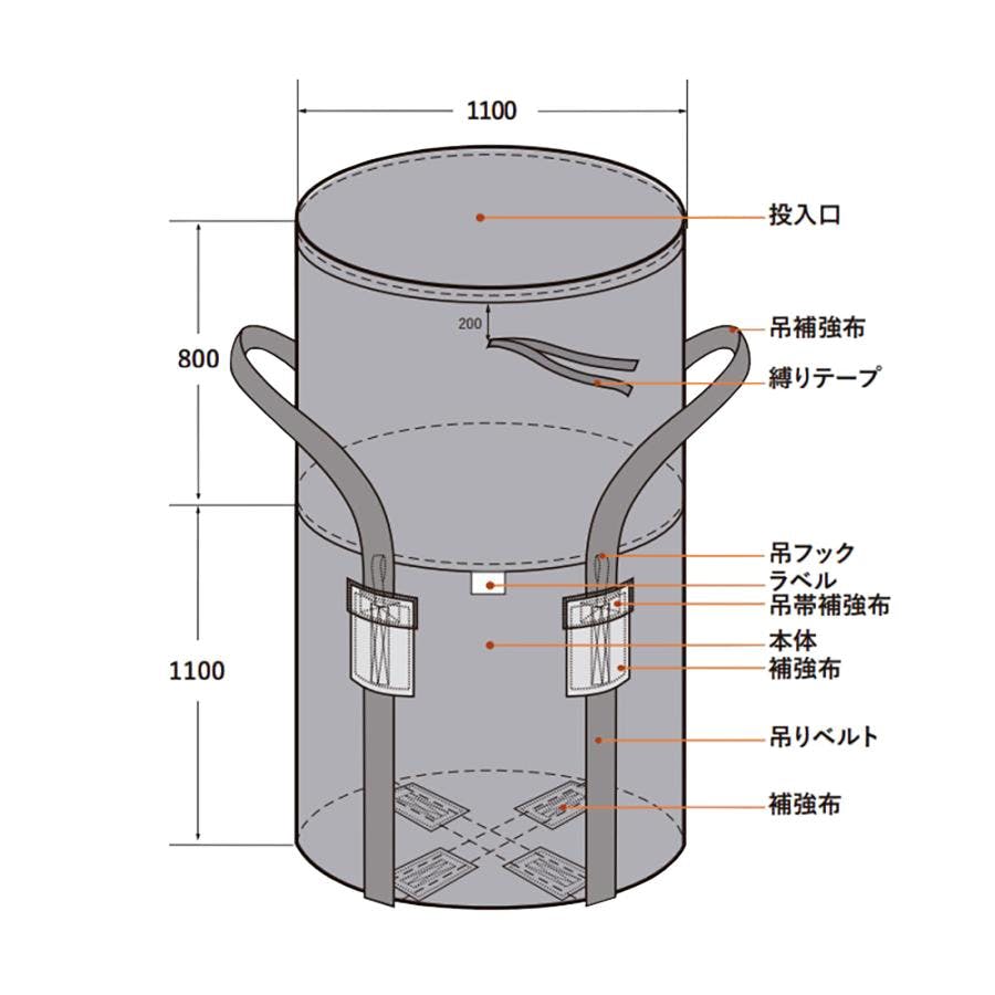 形状:丸形・ベルト2天吊り(4点支持) 容量:1立方メートル 最大充てん質量:20 kN(約2t) 耐候性強度:たて・よこ 240N/cm 以上