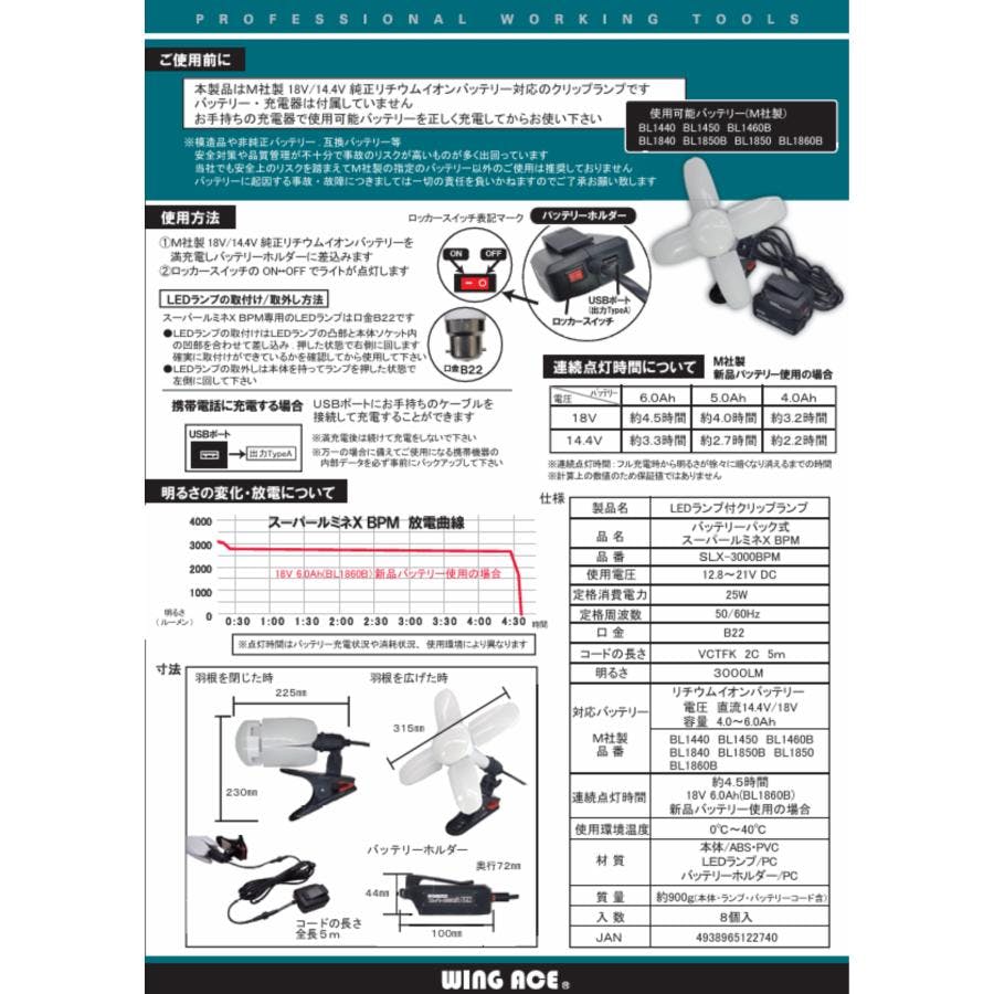 バッテリーパック式 スーパールミネX BPM LED電球付きクリップランプ SLX-3000BPM マキタバッテリー対応 屋内用 作業灯 WING ACE ウィングエース 【送料無料】