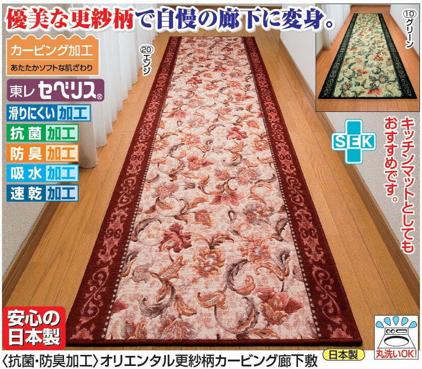 優美な更紗柄で自慢の廊下に変身。 ●キッチンマットとしてもおすすめです。 ●カービング加工、あたたかソフトな肌ざわり ●東レ セベリス(R)