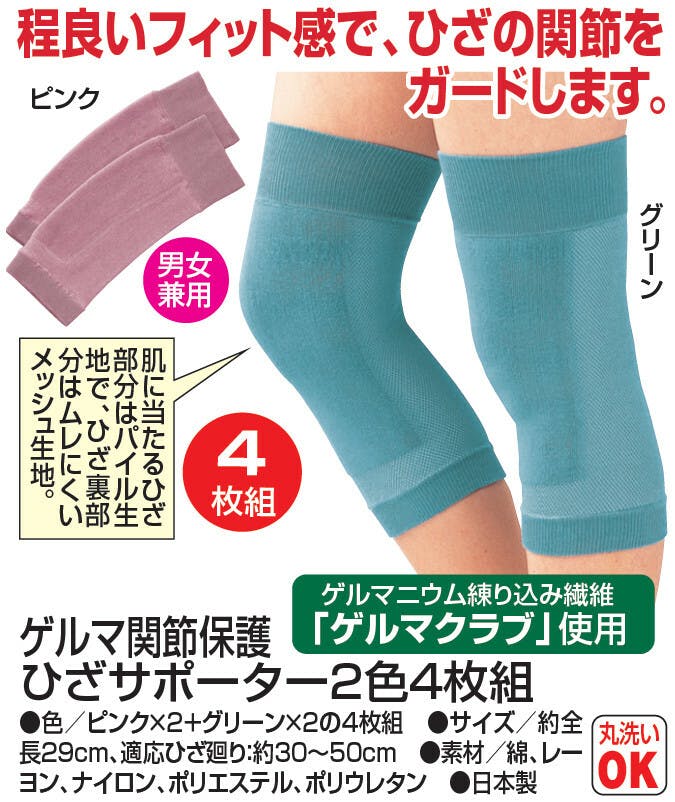 程良いフィット感で、ひざの関節をガードします。 ●色/ピンク×2+グリーン×2の4枚組 ●肌に当たるひざ部分はパイル生地で、ひざ裏部分はムレにくいメッシュ生地。